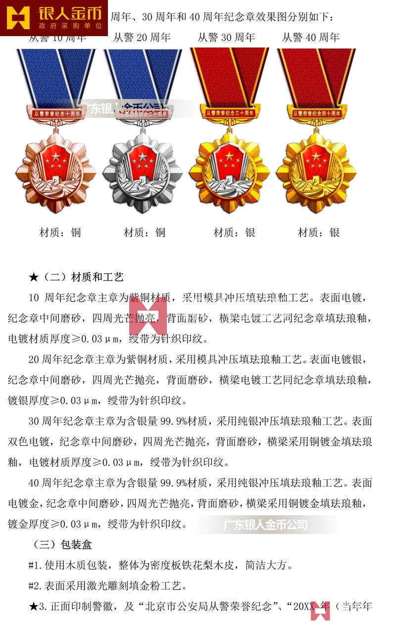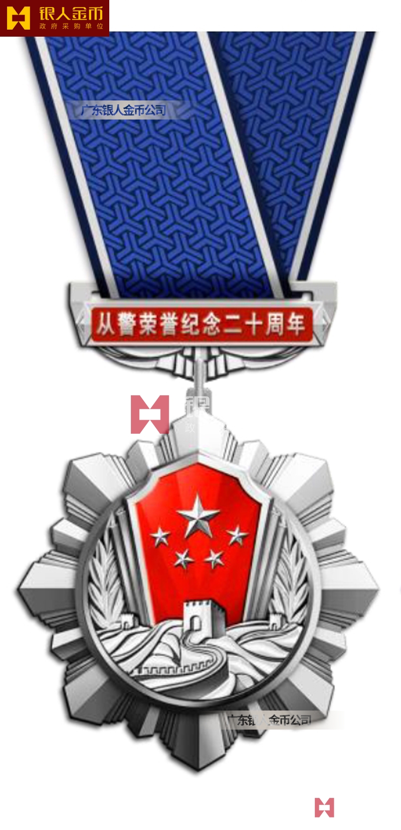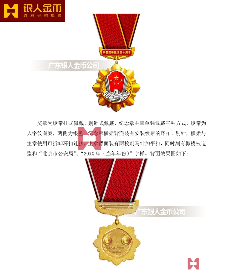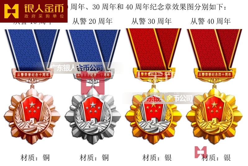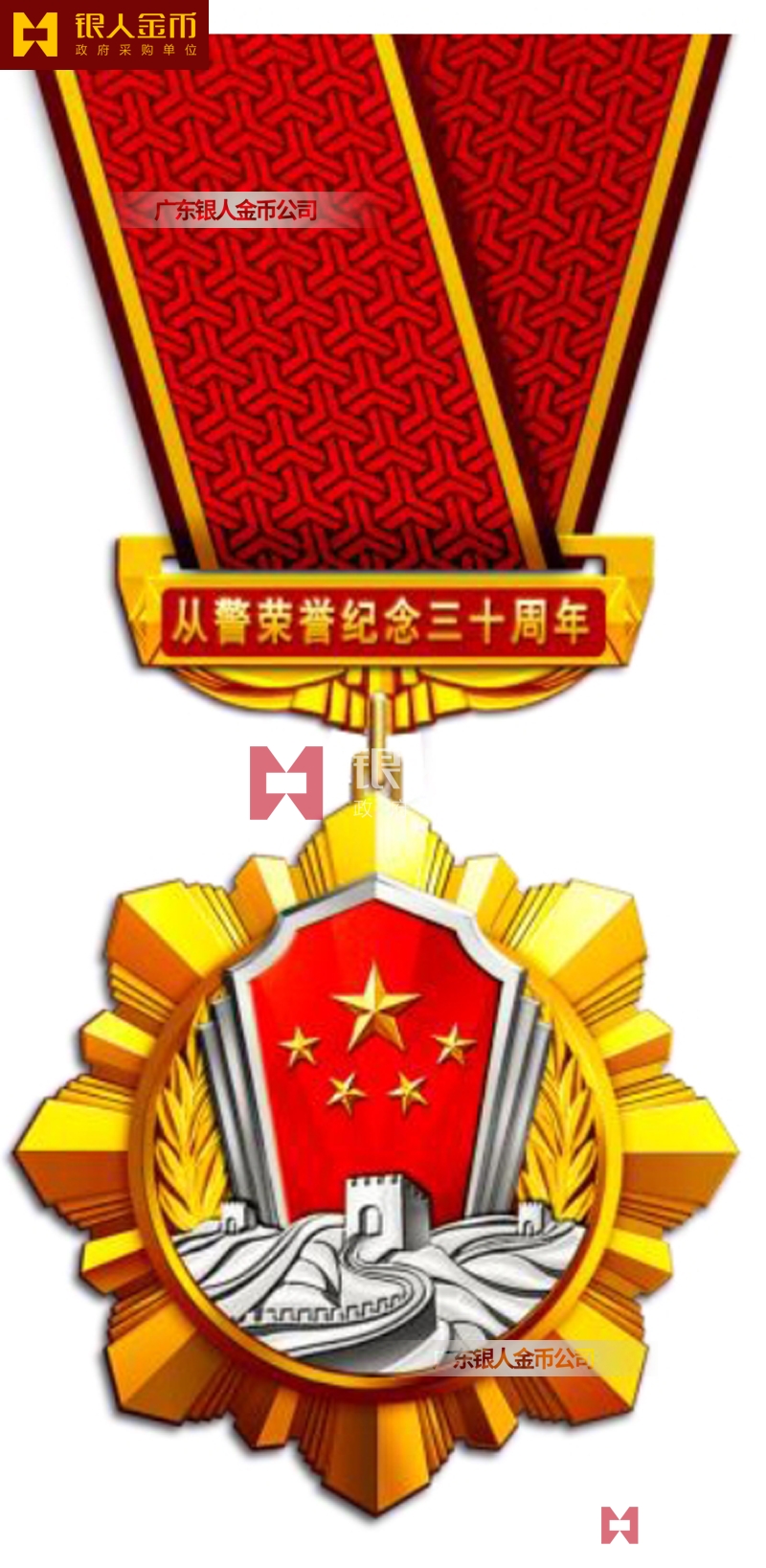 公安民警輔警安保從警10年榮譽銅質紀念章、從警20年榮譽銀質紀念章、從警30年金質榮譽紀念章
