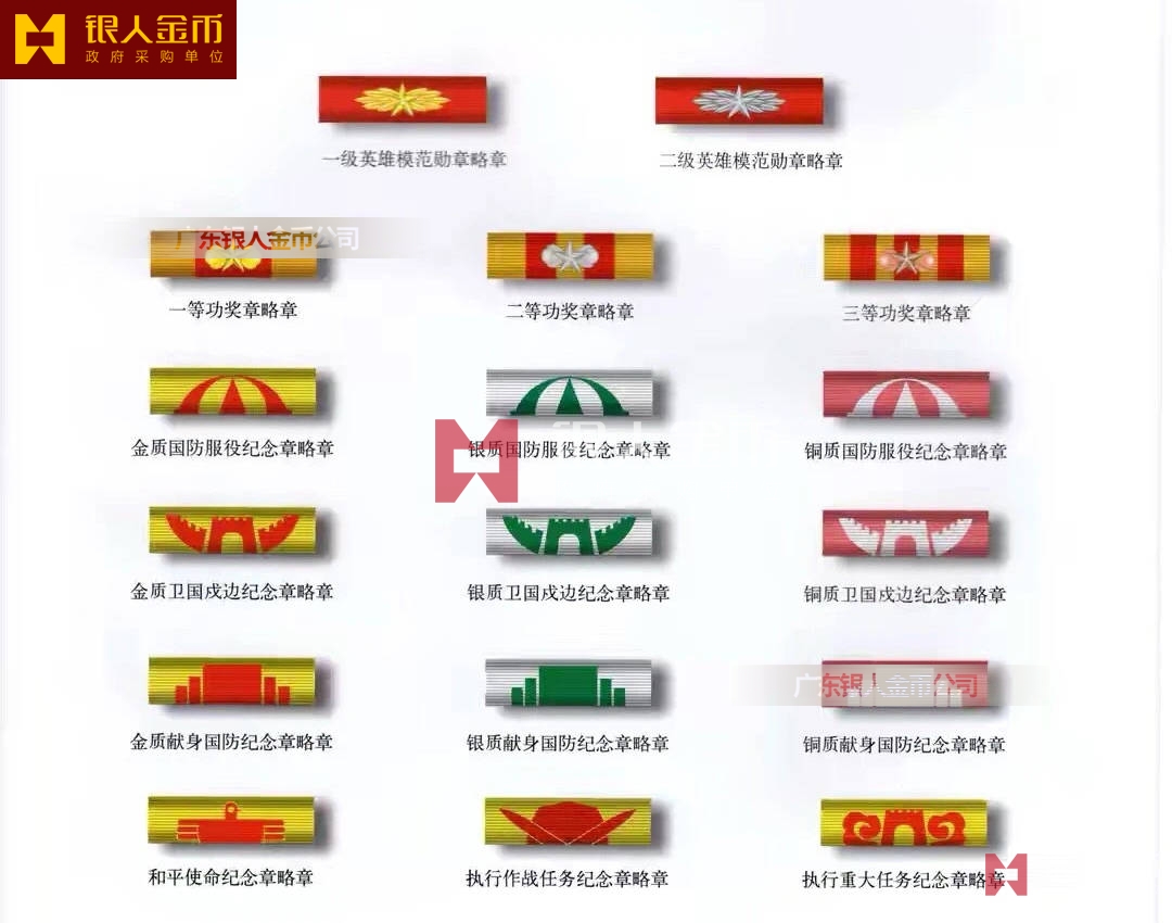 黨中央頒發的國家功勛章和紀念章及功臣獎章、國務院授予的國家功臣勛章和紀念章、中央軍委授予榮獲的軍功章和勛功章與紀念獎章及紀念章包括榮譽獎章和榮譽勛章、原國防部國防科工委發放的勛功章和榮譽章和榮譽證章及紀念徽章、國家部委級表彰的高檔獎牌獎章勛章證章及榮譽紀念牌與榮譽紀念章、各地省委自治區直轄市表彰的獎章勛章與紀念證章、各地區行署州委市委獎勵的獎章獎牌和紀念獎牌與紀念胸章、各公檢法政法委政府單位獎勵表彰的紀念牌、退休紀念章、榮休紀念牌、包括各企事業單位記功記大功獎章、公務員一二三等功獎章。
