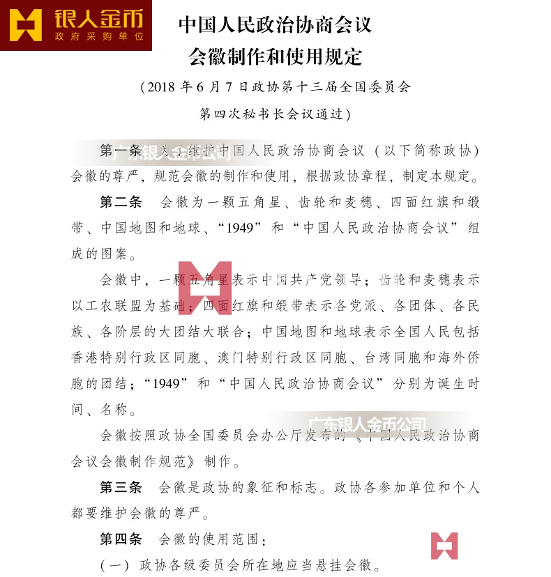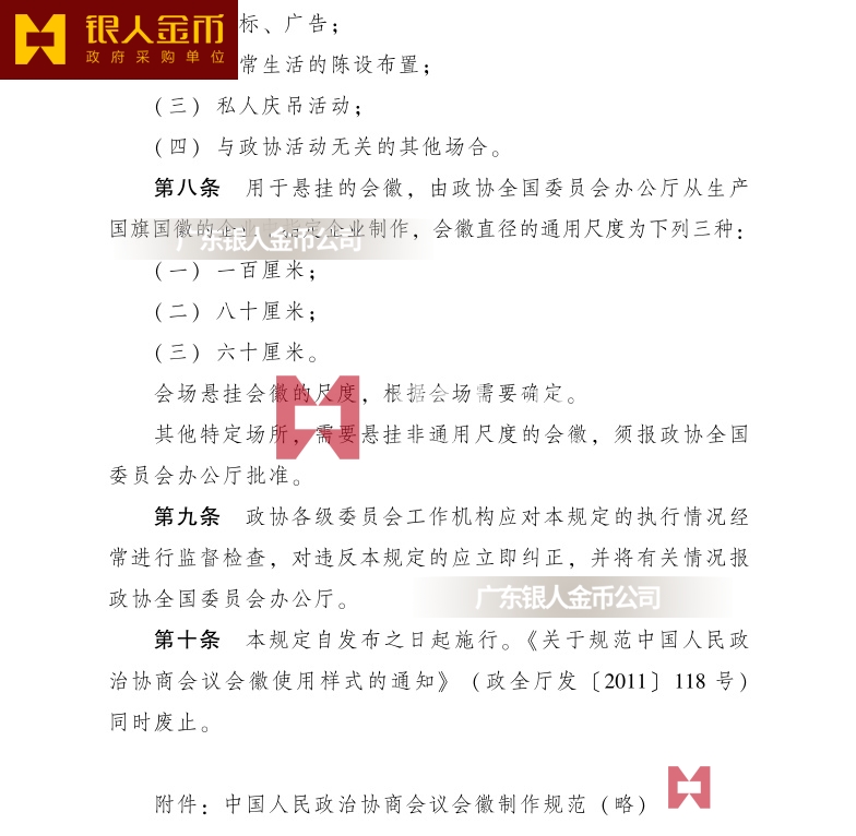 第十條 本規定自發布之日起施行。《關于規范中國人民政治協商會議會徽使用樣式的通知》(政全廳發[2011]118號)同時廢止。