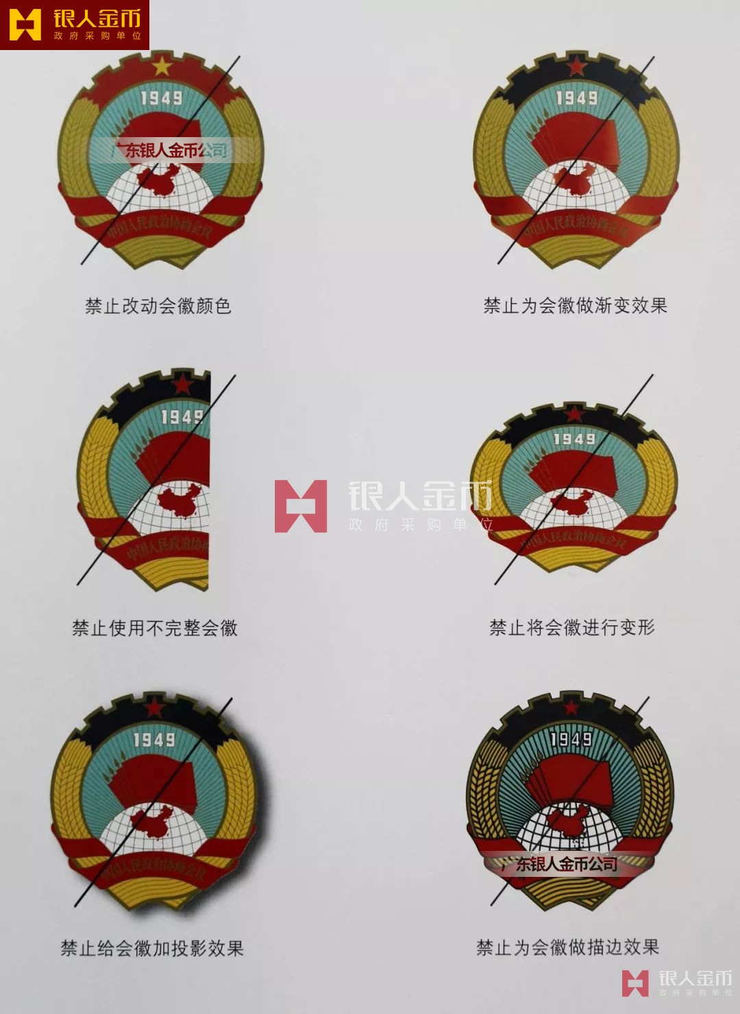 政協會徽在使用時必須嚴格按照規范執行。為保證政協會徽的嚴肅性,嚴禁出現各類錯誤與不規范的使用。以下列舉各例(不僅限于以下幾種),均是不規范的錯誤使用。