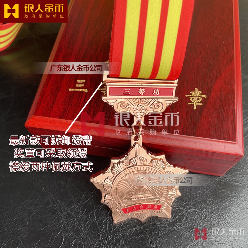 代表一、二、三等功。綬帶可拆卸,上章背后設有別針,獎章可采取領綬、襟綬兩種佩戴方式。