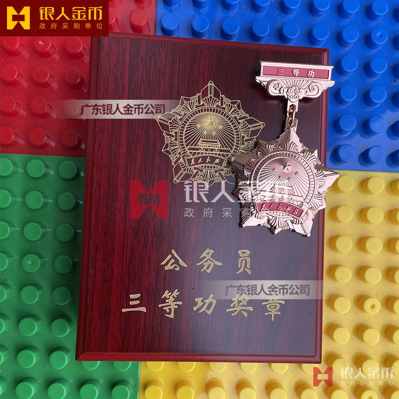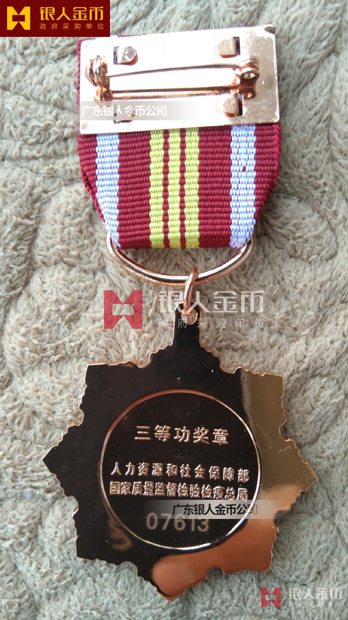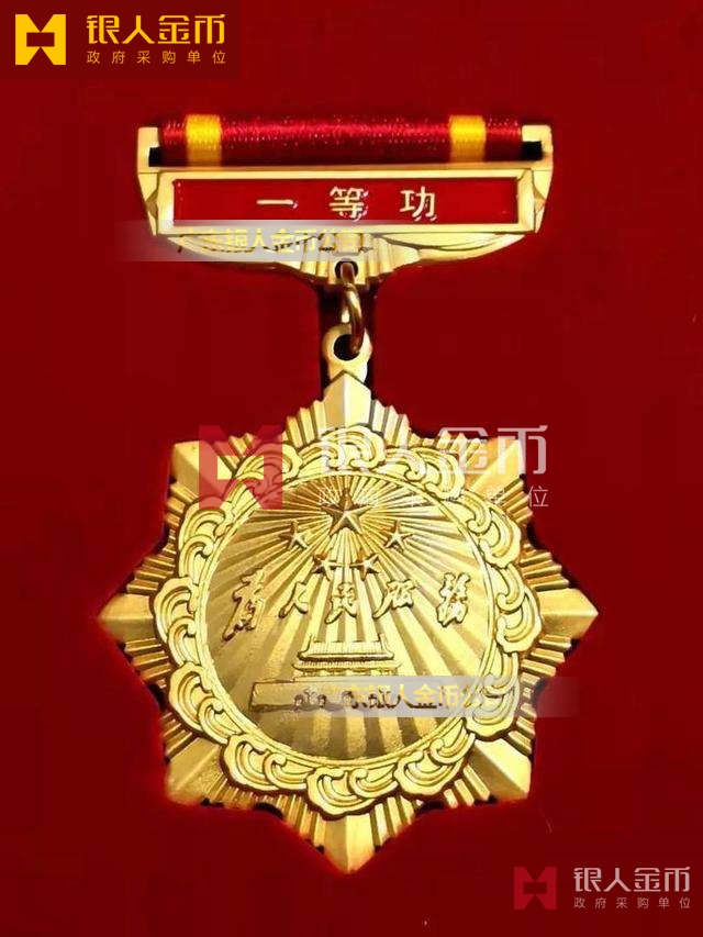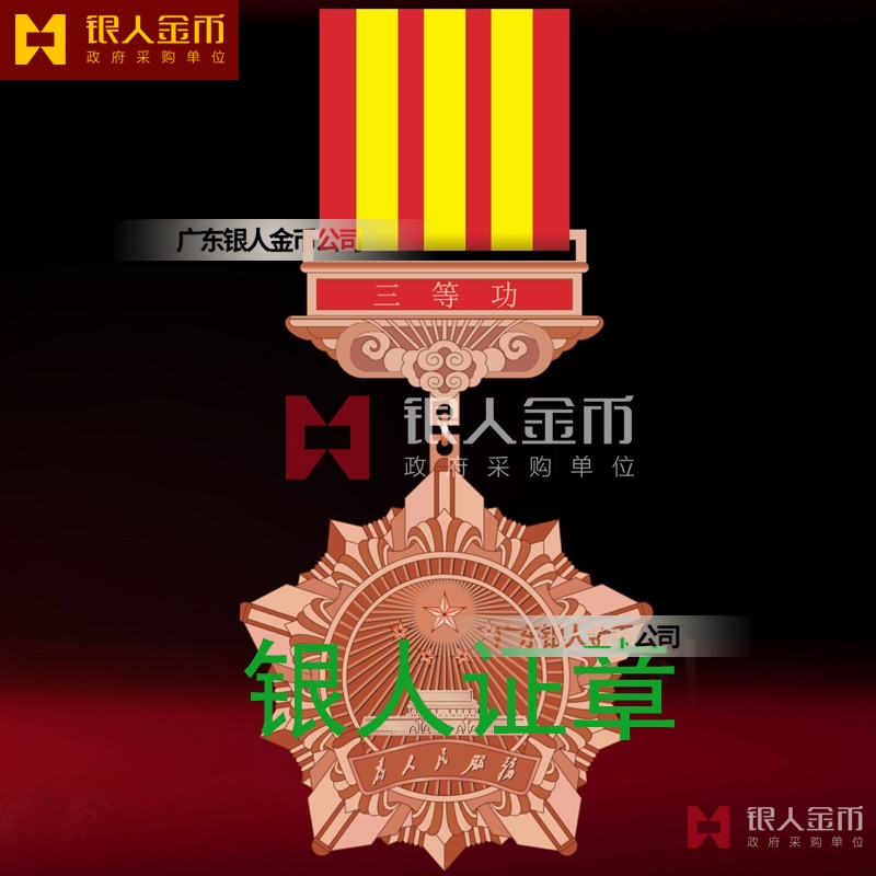 一、二、三等功獎章由銅壓制成型,分別采用鍍金、銀、銅工藝。核心區上部為五星圖案;中部為天安門圖案;下部為毛澤東同志書寫的“為人民服務”字樣,采用紅色填釉工藝;核