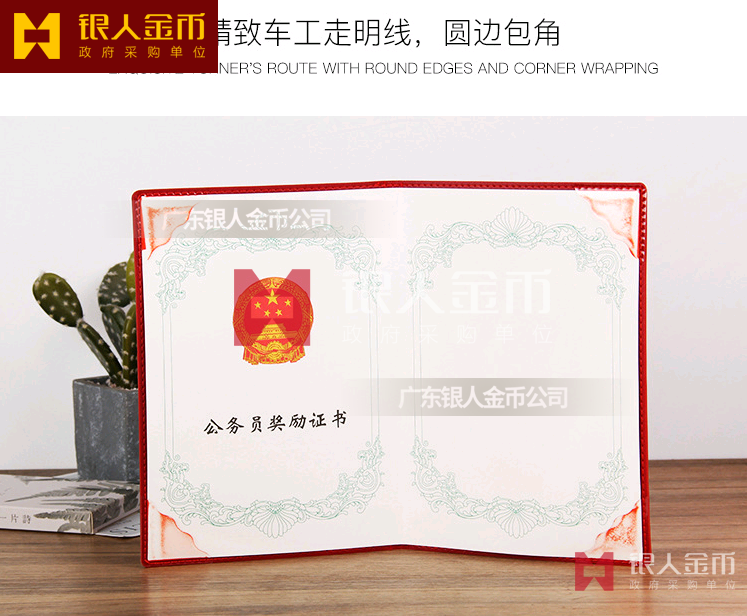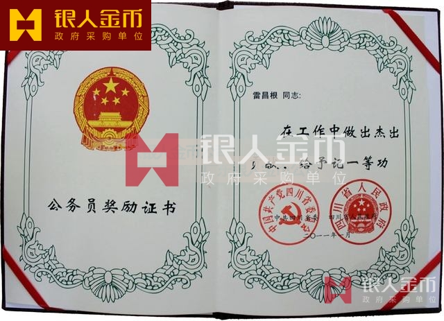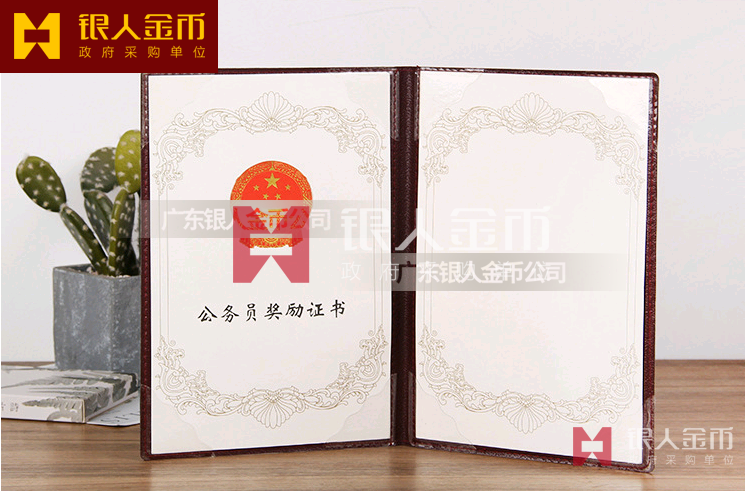 本證書適用于對公務員、公務員集體的獎勵。證書規格為410×290毫米(展開)。封面選用國旗紅色絲綢材料,燙金印制國徽圖案及“公務員獎勵證書”字樣,字體為魏碑,54號字,
