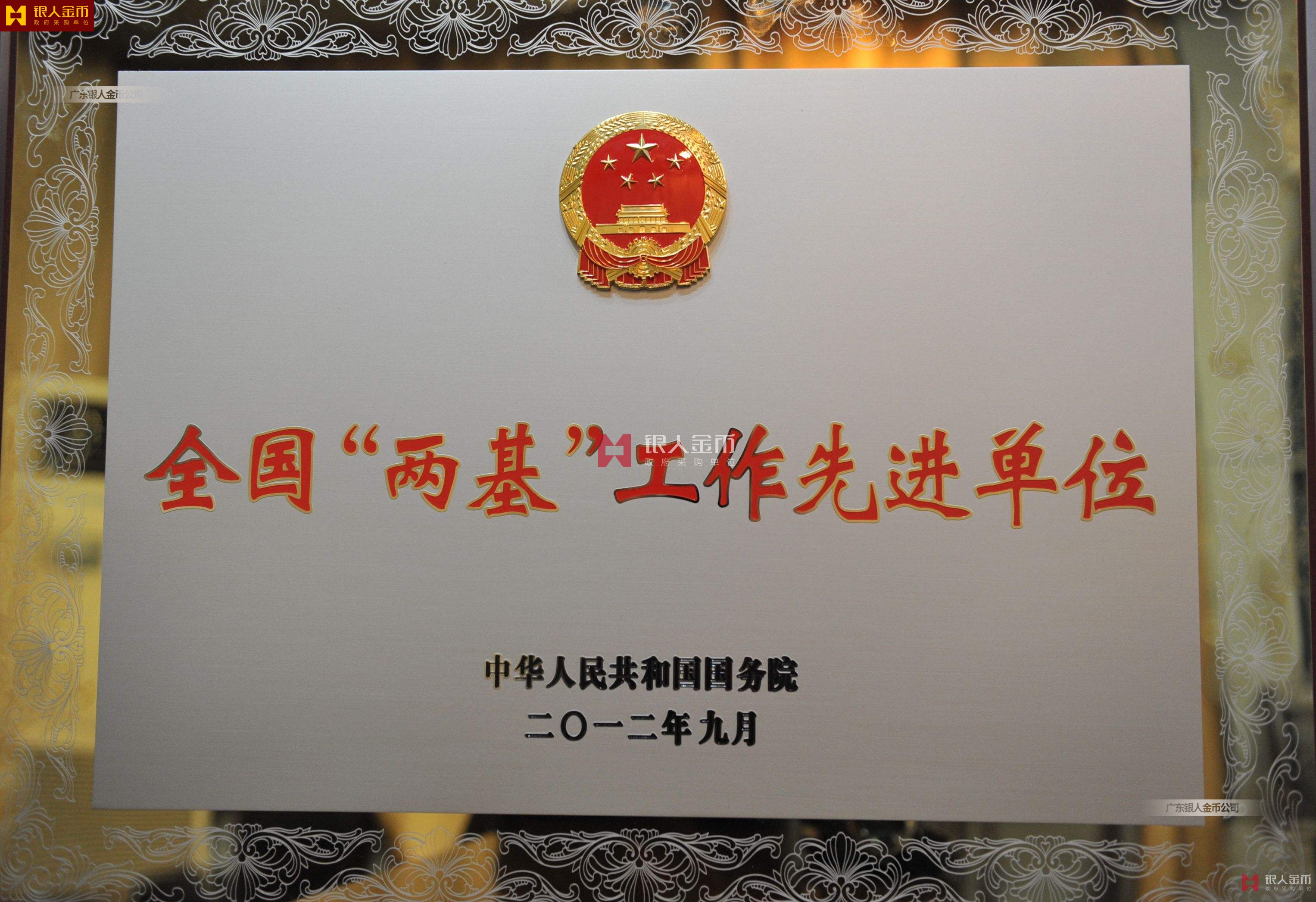 中華人民共和國國務院全國”兩基“工作先進單位獎牌(圖)