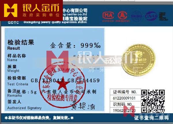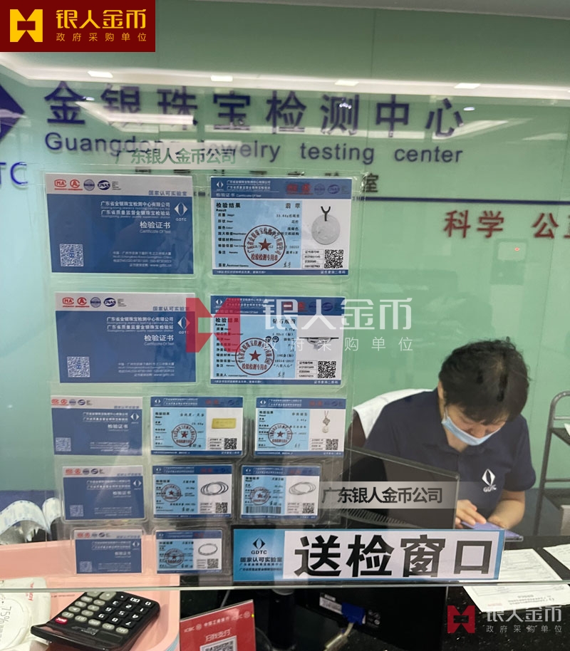 廣東銀人金幣公司承接客戶個性化定制的金銀幣、金銀章、金銀條、金銀牌、金銀盤均由國家質監部門、嚴格檢測、權威鑒定: