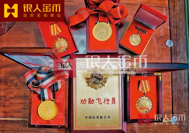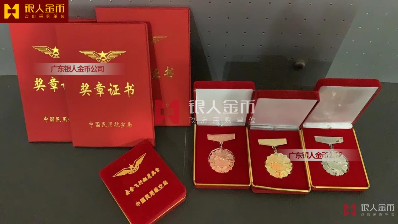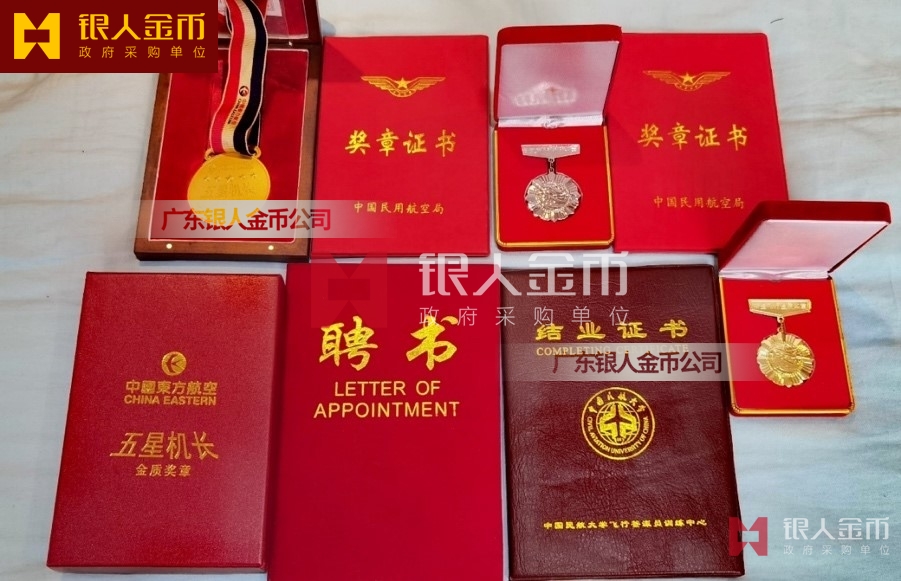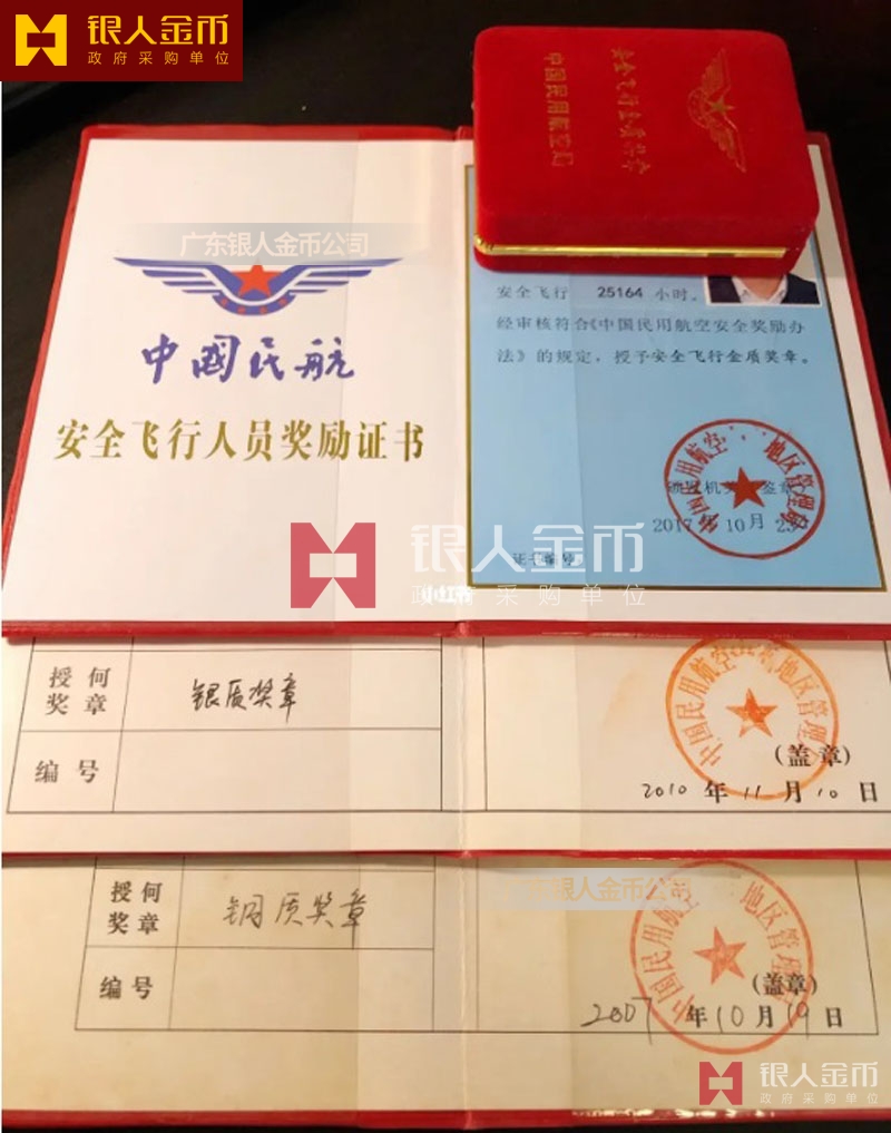中國民用航空總局功勛飛行員獎章證書、中國民用航空局安全飛行金質獎章、銀質獎章、銅質獎章、證書