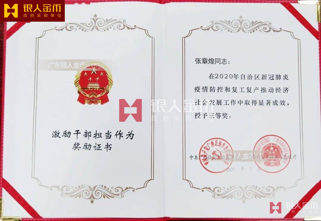 中共廣西壯族自治區委員會、廣西壯族自治區人民政府、抗擊新冠肺炎疫情防控工作和復工復產推動經濟社會發展工作三等獎證書、激勵干部擔當作為獎勵證書榮譽稱號獎牌獎章證書(圖)--【廣州銀人勛章獎章紀念章獎牌徽章廠有限公司】