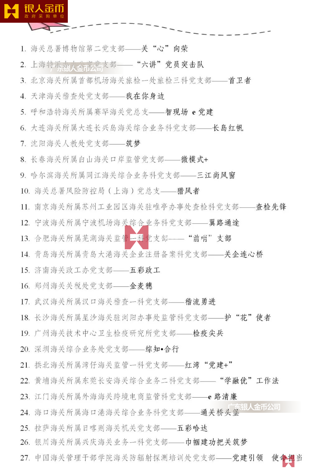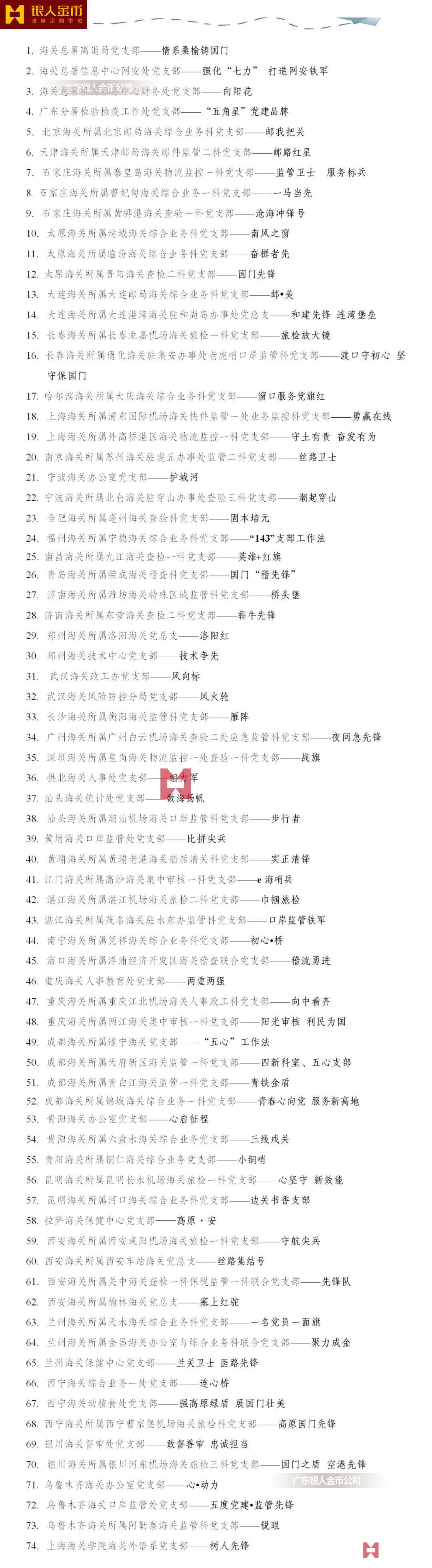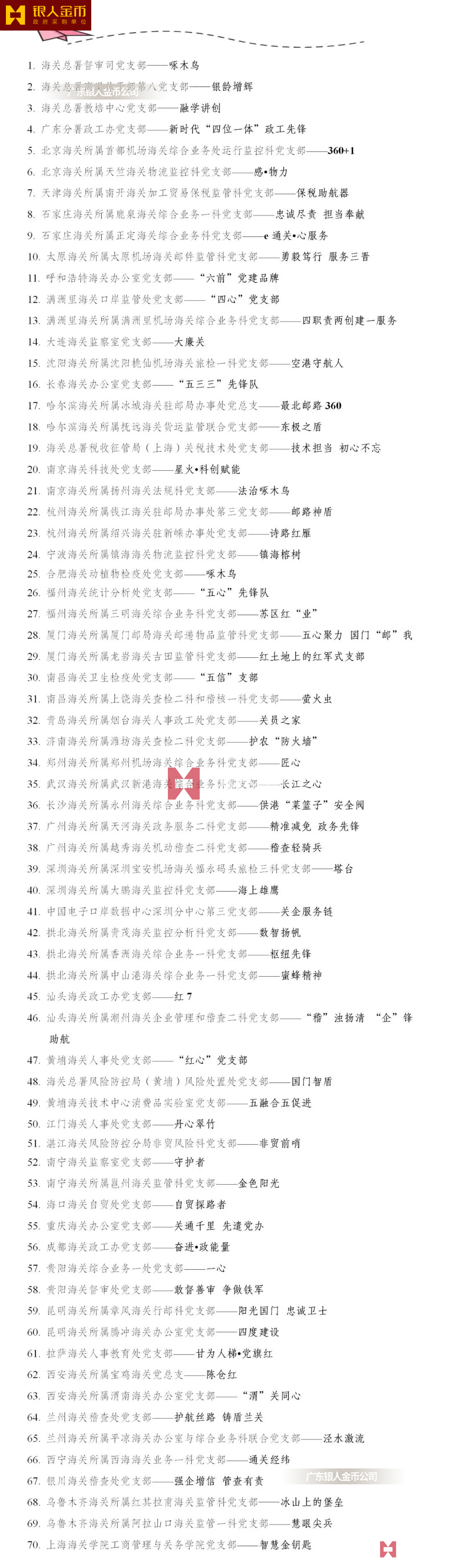 近日,海關總署黨委對151個全國海關黨建示范品牌、74個全國海關黨建培育品牌予以復核認定,新評選27個全國海關黨建示范品牌、70個全國海關黨建培育品牌,反映了全國海關以習近平新時代中國特色社會主義思想為指導,深入學習宣傳貫徹黨的二十大精神,扎實開展學習貫徹習近平新時代中國特色社會主義思想主題教育,著力鞏固拓展“強基提質工程”成果,促進黨建品牌不斷“提檔升級”。