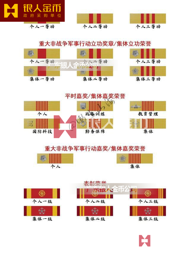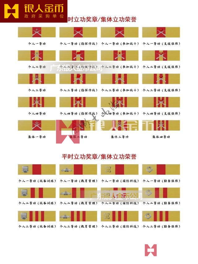 個人一等功(戰備訓練)、個人一等功(教育管理)、個人一等功(國防科技)、個人一等功(勤務保障)