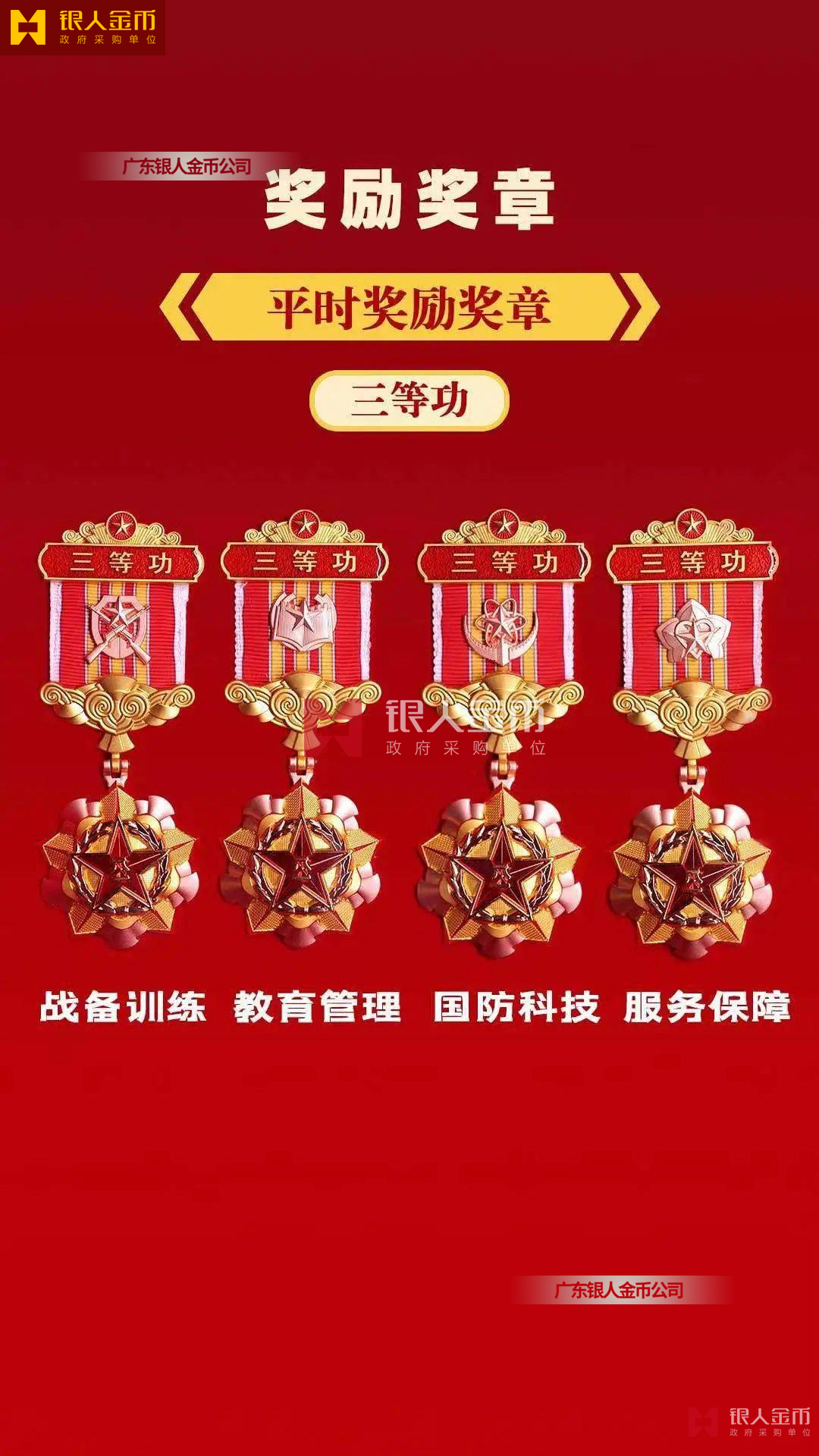中央軍委政治工作部監制授予:陸軍、海軍、空軍——戰務訓練三等功獎章、教育管理三等功獎章、國防科技三等功獎章、服務保障三等功獎章