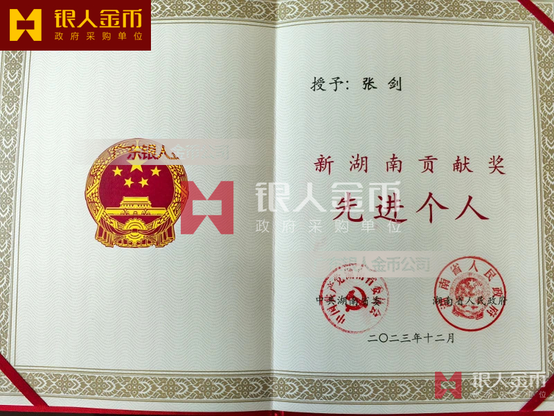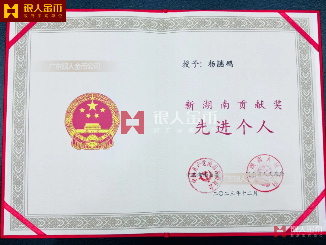 中共湖南省委、湖南省人民政府——新湖南貢獻獎先進個人證書(榮譽證書、獎勵證書)