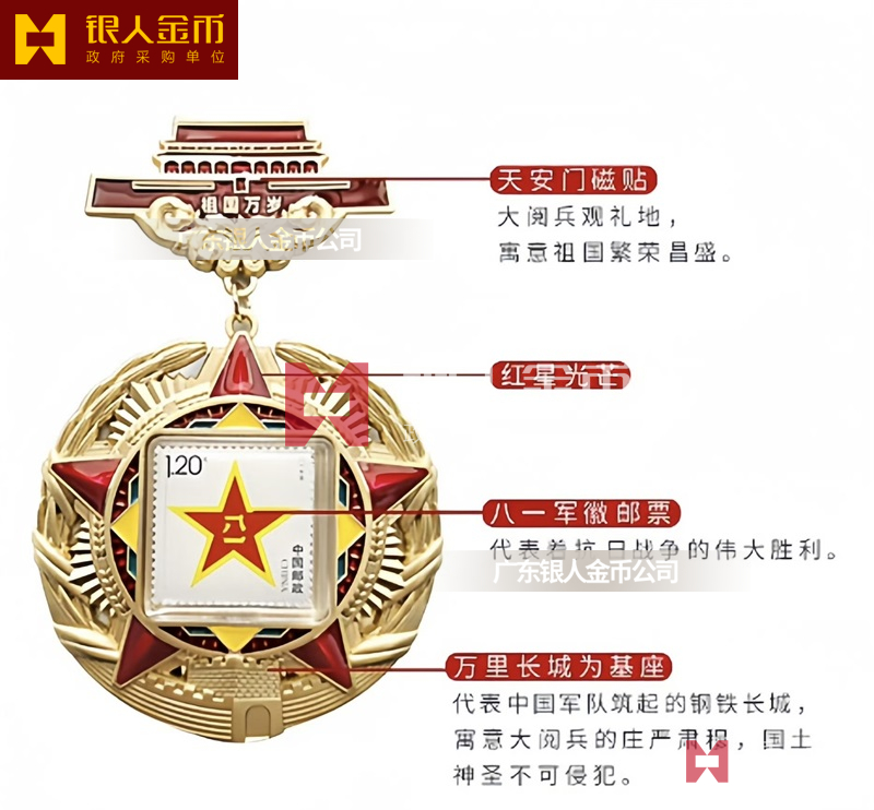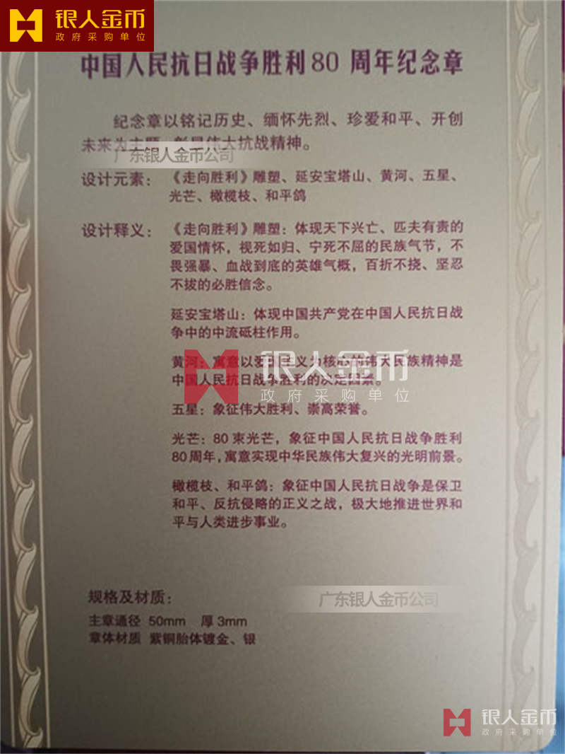 國內其他紀念章(如國慶70周年紀念章和光榮在黨50年紀念章)由 廣東銀人金幣公司造幣廠鑄幣廠制幣廠造幣公司鑄幣公司制幣公司企業生產,明確與特定80周年主題關聯。公司系專業從事禮飾紀念品生產的專業廠家,集設計,生產,銷售為一體。曾成功承制98“抗洪系列紀念章”、99“澳門回歸系列紀念品”、2000年中國“神舟”無人飛船和 2003中國“神州”五號載人飛船升空紀念品、2001“中國共 產黨建黨八十周年”、以及2008年“北京申奧紀念盤”等金 屬制品,產品款式新穎、造型美觀、用料考究、工藝精湛,深受國內外市場的青睞。為了更好地回報社會。服務客戶,本公司以“質量第一,信譽至上”為宗旨,分別在北京、上 海、澳門等地設有聯系點,始終致力于新產品的開發和研制,以不斷滿足市場的需求。本公司主要生產:銅質紀念盤、獎牌、工號牌、產品銘牌、紀念牌、工號牌、產品銘牌、紀念徽章、金卡、鑰匙扣、領帶夾、名片盒、辦公文具、收藏證書、廣告促銷紀念品、旅游紀念。珍藏品及木制工藝品等,竭誠歡迎國內外各界人士來圖、來樣洽談訂制,或委托本公司代為設計制造。經營范圍包括徽章、獎章、勛章、紀念章、獎牌、獎杯、紀念盤、證書、門牌、標牌、工號牌,五金飾物、服裝配件、皮帶扣、領帶夾,模具,貴金屬首飾及金銀制品制造、銷售,其他印刷品印刷,包裝裝潢印刷品印刷,辦公用品、金屬工藝品、木制工藝品、包裝盒、體育賽事用品、文化旅游紀念品的設計、生產、銷售; ? ?抗日勝利八十周年抗戰紀念章定制訂做訂制定做制做紀念章工廠制作的制造廠家企業單位公司。