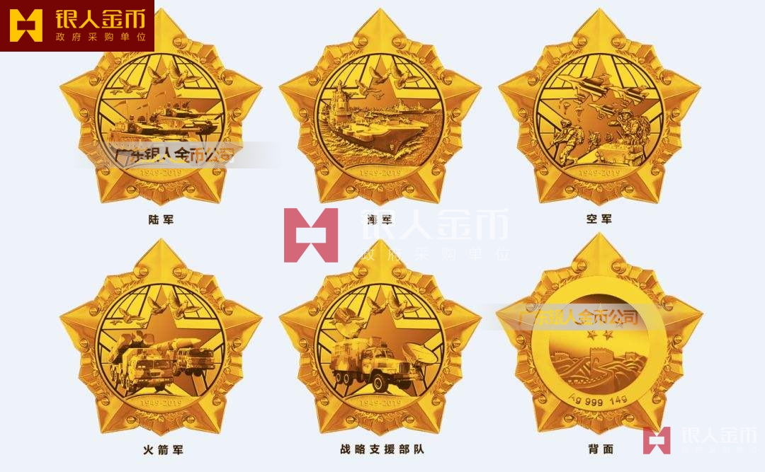 正面以陸軍、海軍、空軍、火箭軍、戰略軍五大軍種主圖案,呈現了五大軍種斗志昂揚的精神風貌,背面圖案為五星及長城,寓意共產黨領導下的人民軍隊,是保衛祖國的鋼鐵長城。