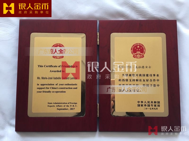 除此之外,還是重要證章和金銀幣文化產品的制造者,比如黨員徽章、黨徽、體育賽事運會獎牌、黨政單位授予獎牌、部分授權委托生產、設計、定制國家級榮譽獎章及紀念章等通俗來講,廣東銀人金幣公司不僅可以造章(包括金銀章、紀念章、獎章、勛章);還可以制作各種證章、徽章;比如中共新疆自治區黨委組織部監制中組部標準黨員徽章、中共湖南省委辦公廳監制中共中央組織部標準指定定點黨徽、海南省政府外事僑務辦公室頒授的"國賓接待榮譽酒 店“稱號牌匾獎牌、以褒獎該酒店在博鰲亞洲論壇期間接待國家元首及政府首腦的出色表現。