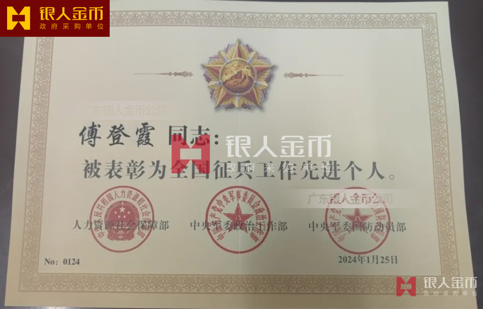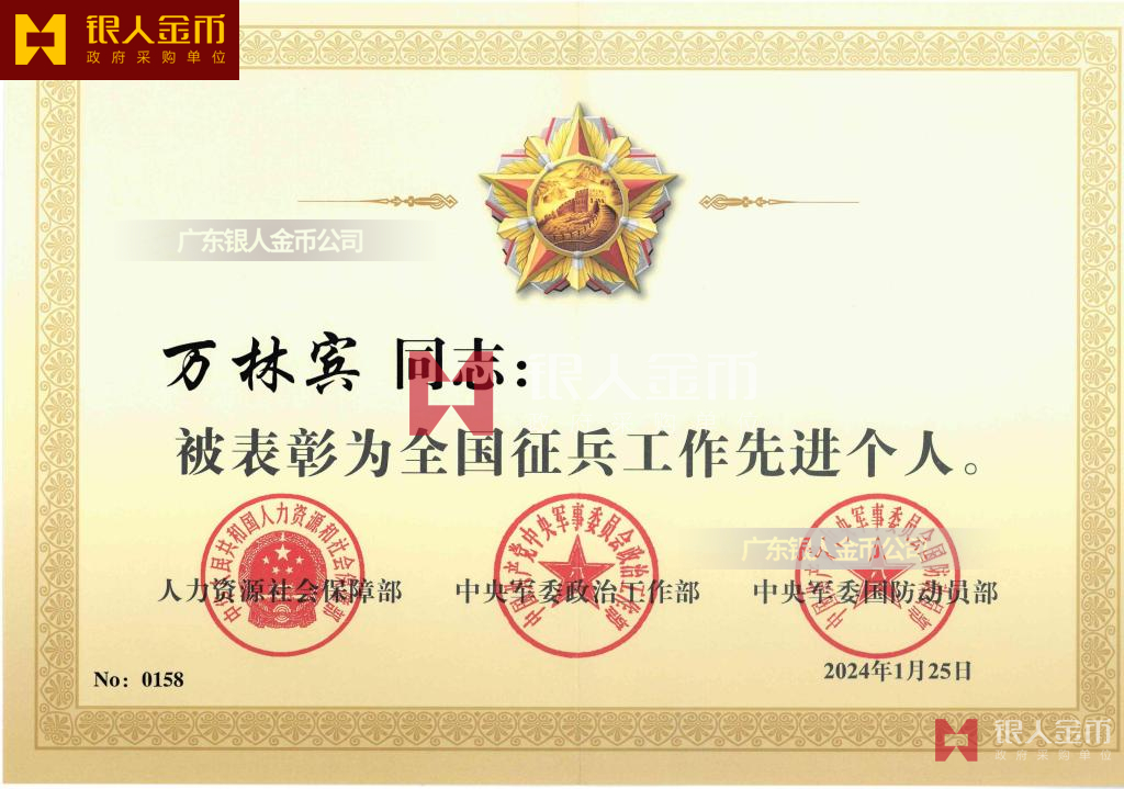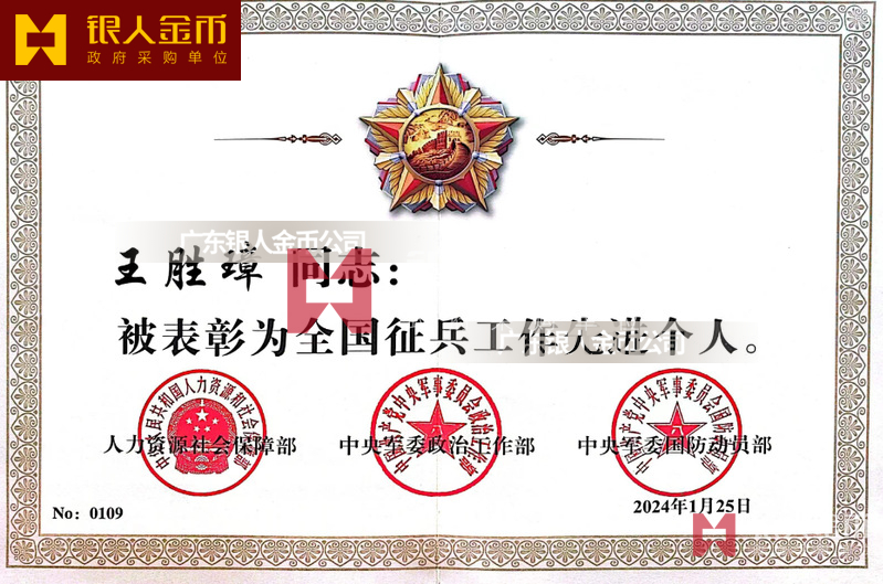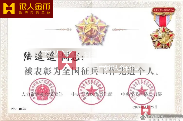中央軍委政治工作部全國征兵工作先進單位獎牌證書/先進個人獎章證書(圖)