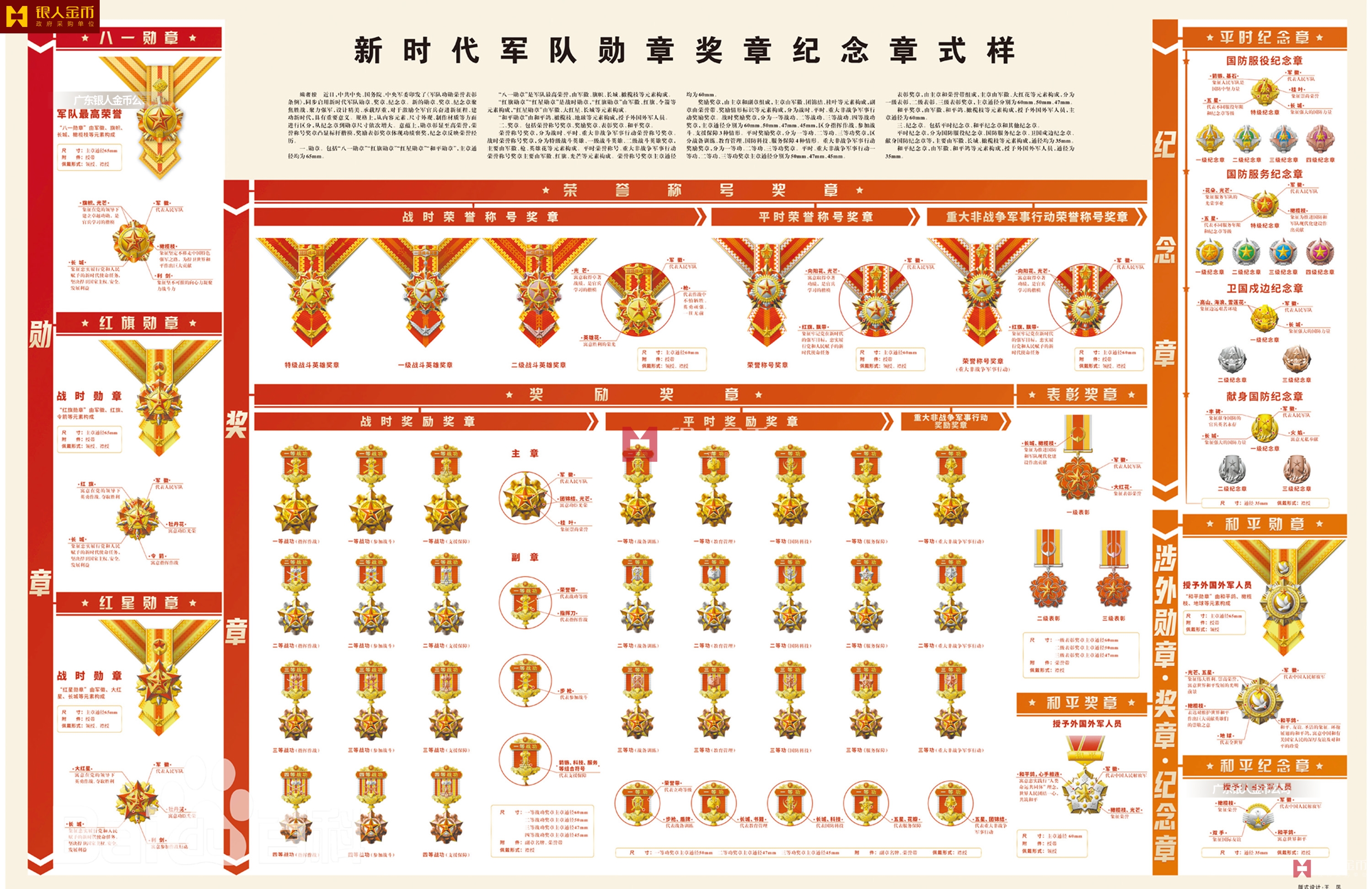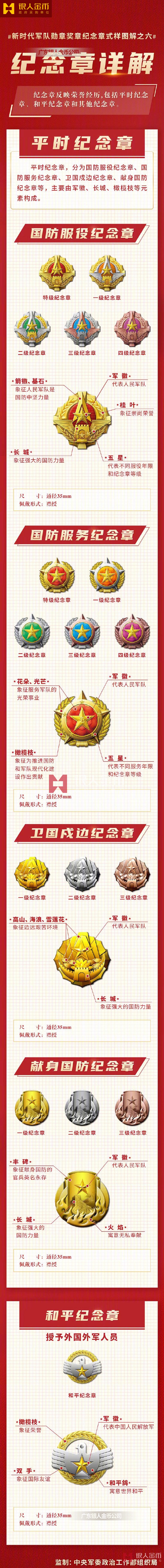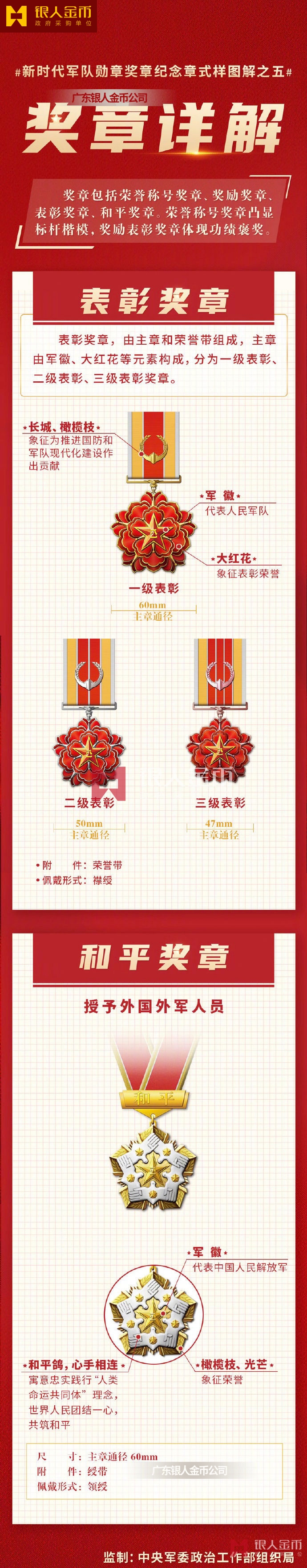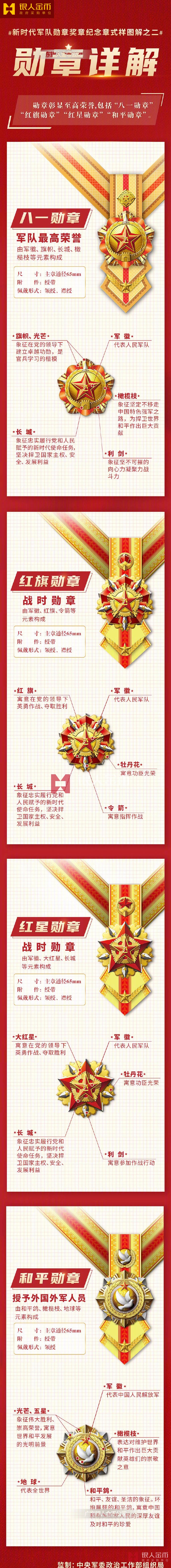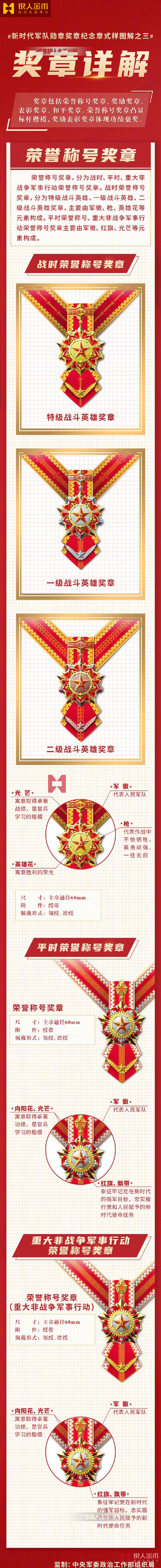 近日,《軍隊功勛榮譽表彰條例》印發,同步啟用新時代軍隊勛章、獎章、紀念章:①勛章。包括“八一勛章”“紅旗勛章”“紅星勛章”“和平勛章”,主章通徑均為65mm。②獎章。包括榮譽稱號獎章、獎勵獎章、表彰獎章、和平獎章。③紀念章。包括平時紀念章、和平紀念章和其他紀念章。中央軍委最新版新時代部隊戰區榮譽稱號軍隊勛章、獎章、紀念章(定制標準)