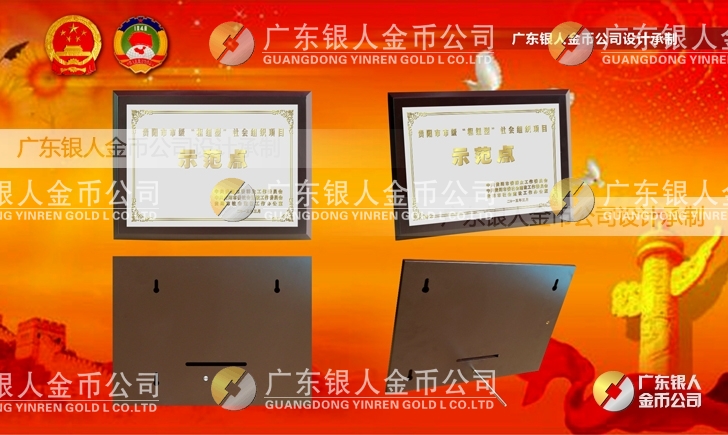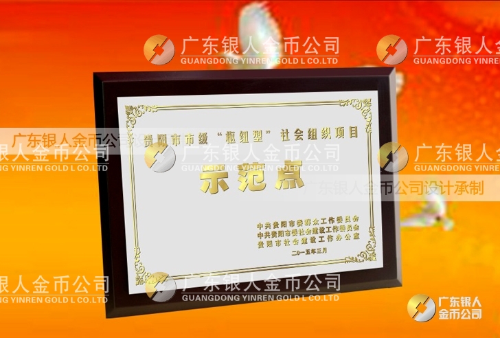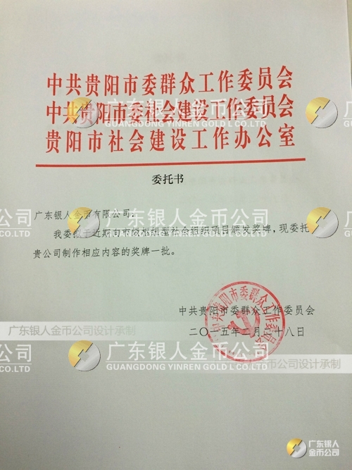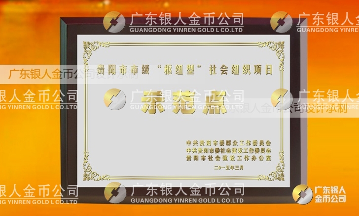 廣東銀人金幣公司設計制作承接中共貴陽市委、民政局、財政局、群工委、中共貴陽市委社會建設工作委員會、貴陽市社會建設工作辦公室表彰樞紐型社會組織項目榮譽獎狀、先進集體獎牌、先進單位獎牌、先進個人牌匾、高檔鈦金獎牌定制。