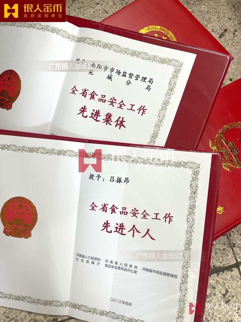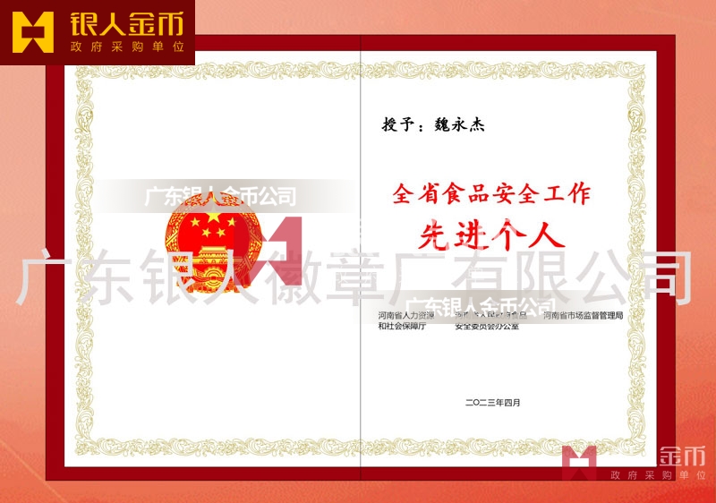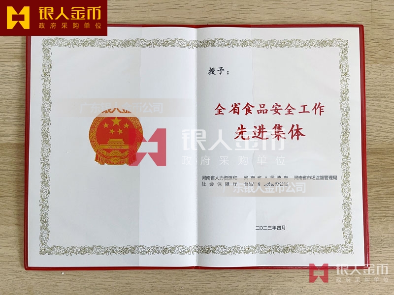 河南省政府全省食品安全工作表彰獎勵證書定制制作_河南省人力資源和社會保障廳獎勵表彰榮譽證書定做_河南省市場監督管理局榮譽獎勵表彰證書訂制